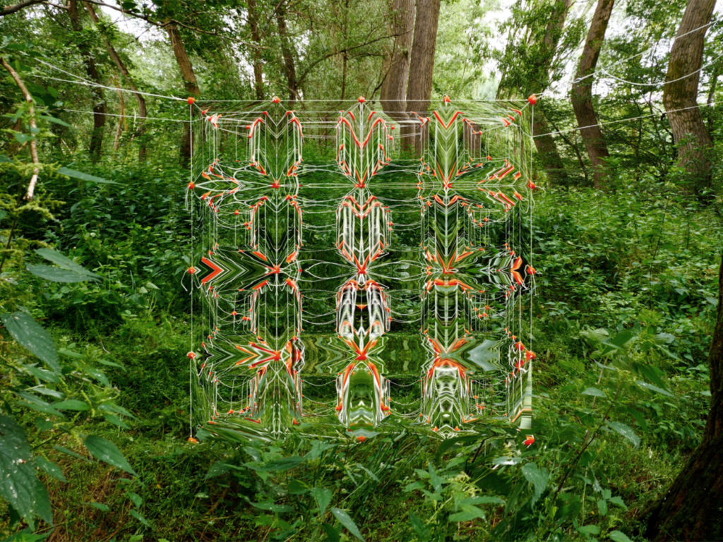 The constructed grid represents a rigid Euclidean space—an abstract universalizable system. However, this grid becomes flexible through its materiality and dynamic through its interrelation within its surroundings. It cannot build tension on its own and has to be lifted and carried by nearby objects. These objects construct reference points and determine the tension, direction and proportions of the grid, whose shape and movement are specific depending on where it is positioned. An abstract conceptual object is becoming concrete by the agency of specific places.